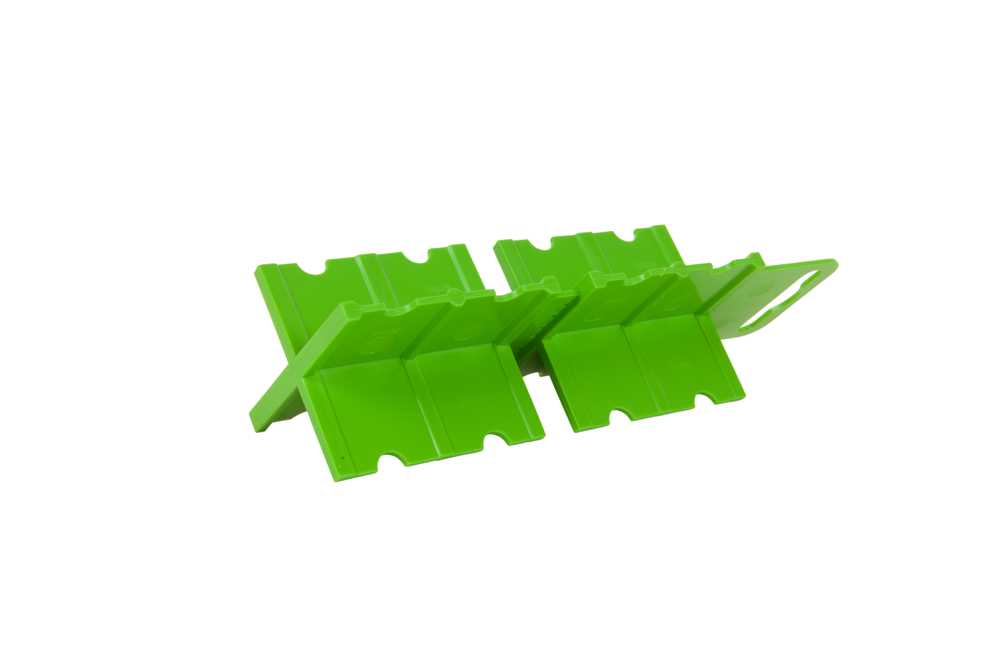 Tools for securing spaces between decking boards. The distance tool comes in pairs and is broken in two before use. The distances have the option of 3,4,5 or 6mm intervals. To speed up mounting use 2 or more per board and then move them to the next board after mounting the screw/nail.