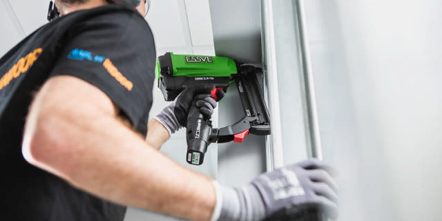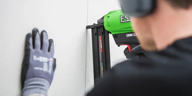 Den kraftige dykkertpistolen fra ESSVE benyttes for enkelt og effektivt feste innerveggsprofiler, samt montasje av Ultraboard på profiler i system Nail-It Indoor.